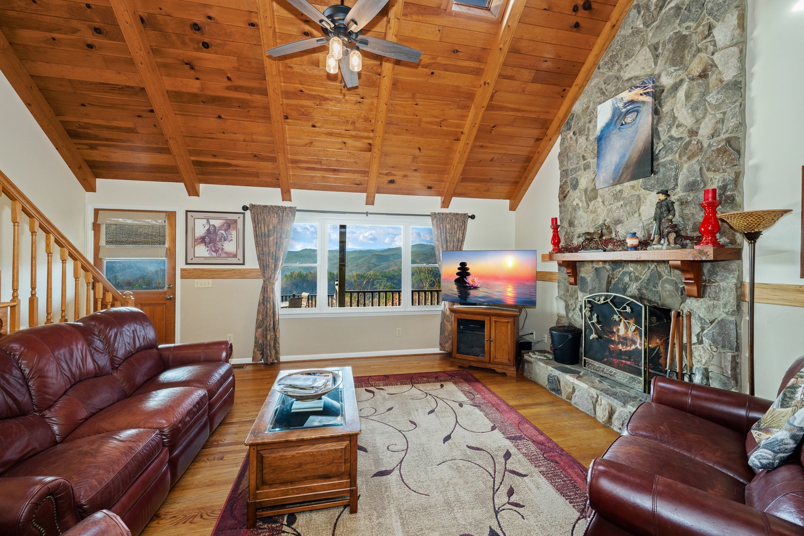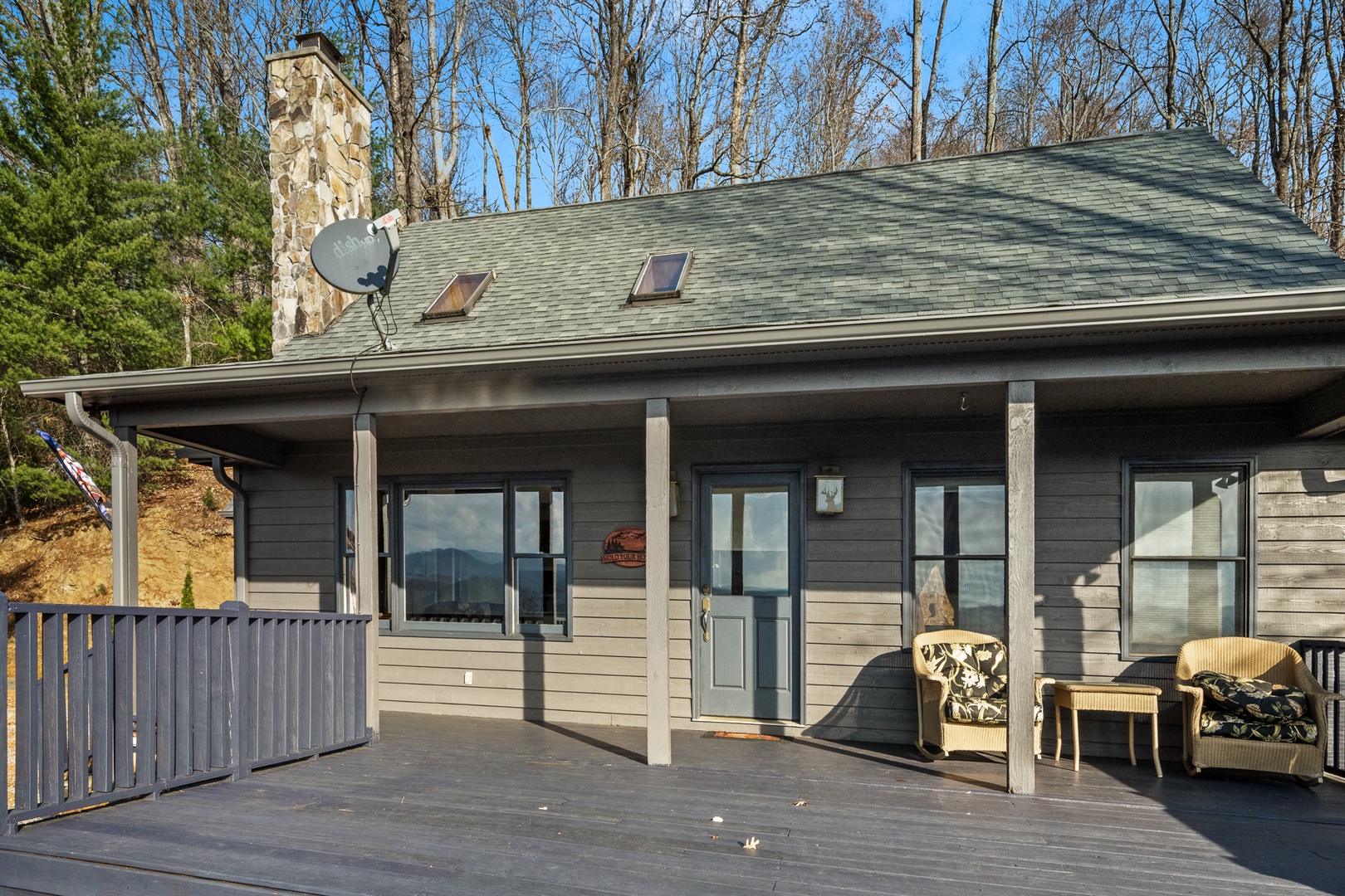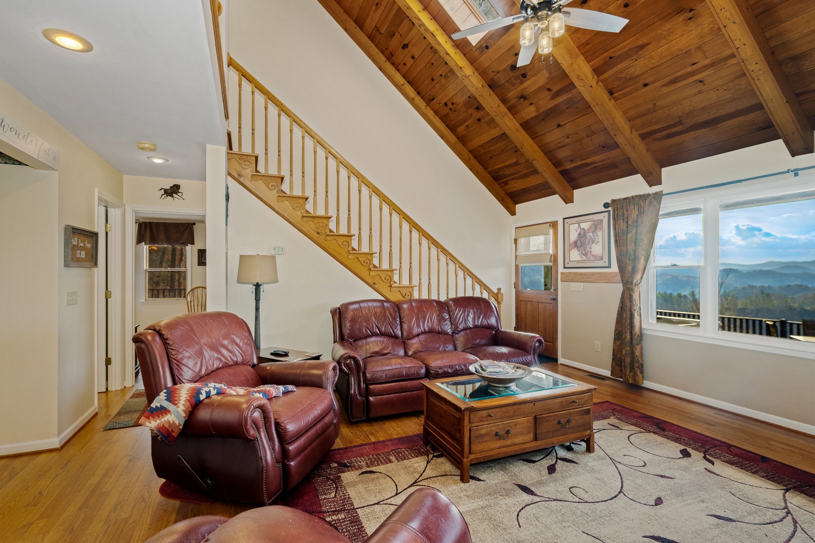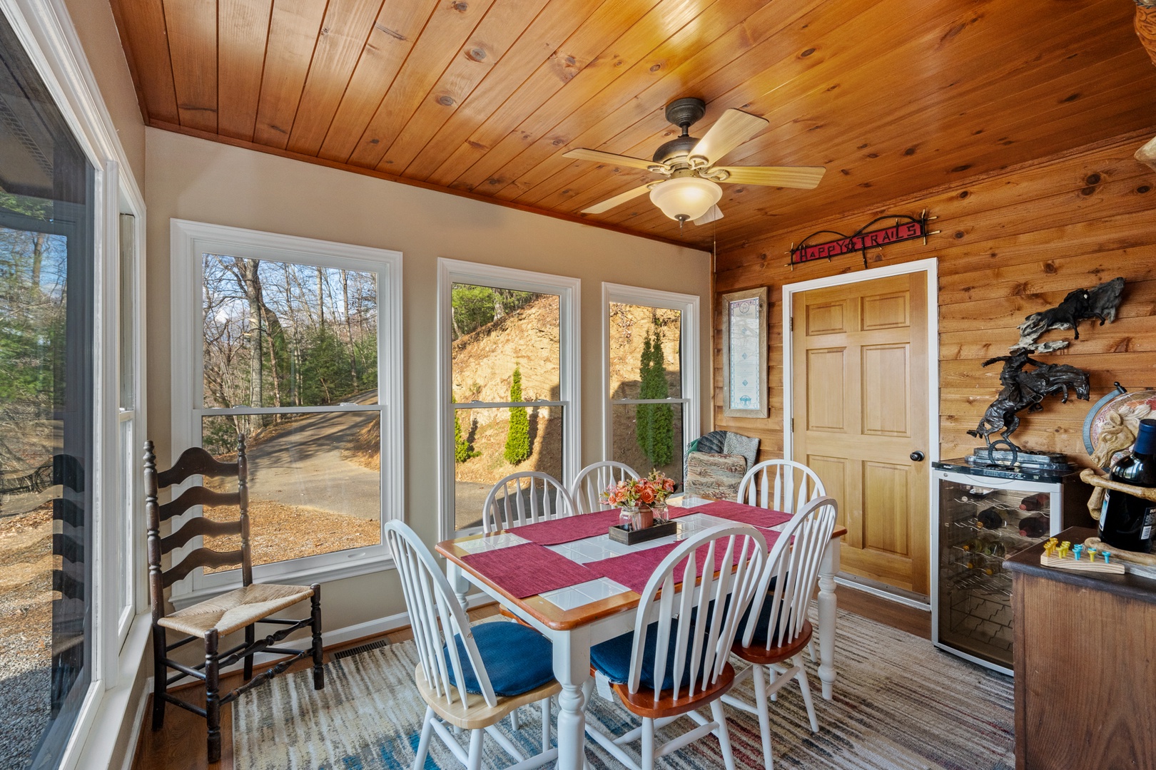 The fully equipped kitchen boasts granite countertops and opens into a bright dining area surrounded by windows that frame the beautiful mountain scenery. Wi-Fi and satellite TV ensure modern convenience, even in your peaceful retreat.