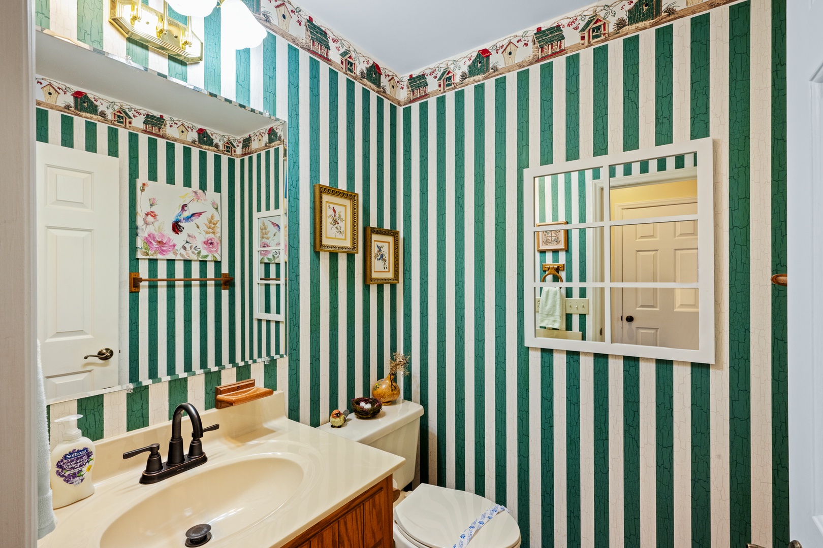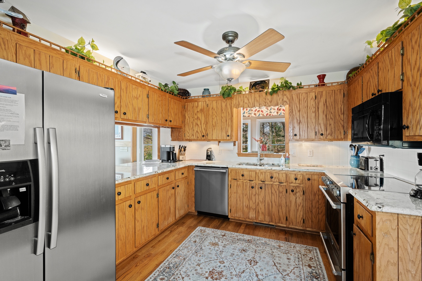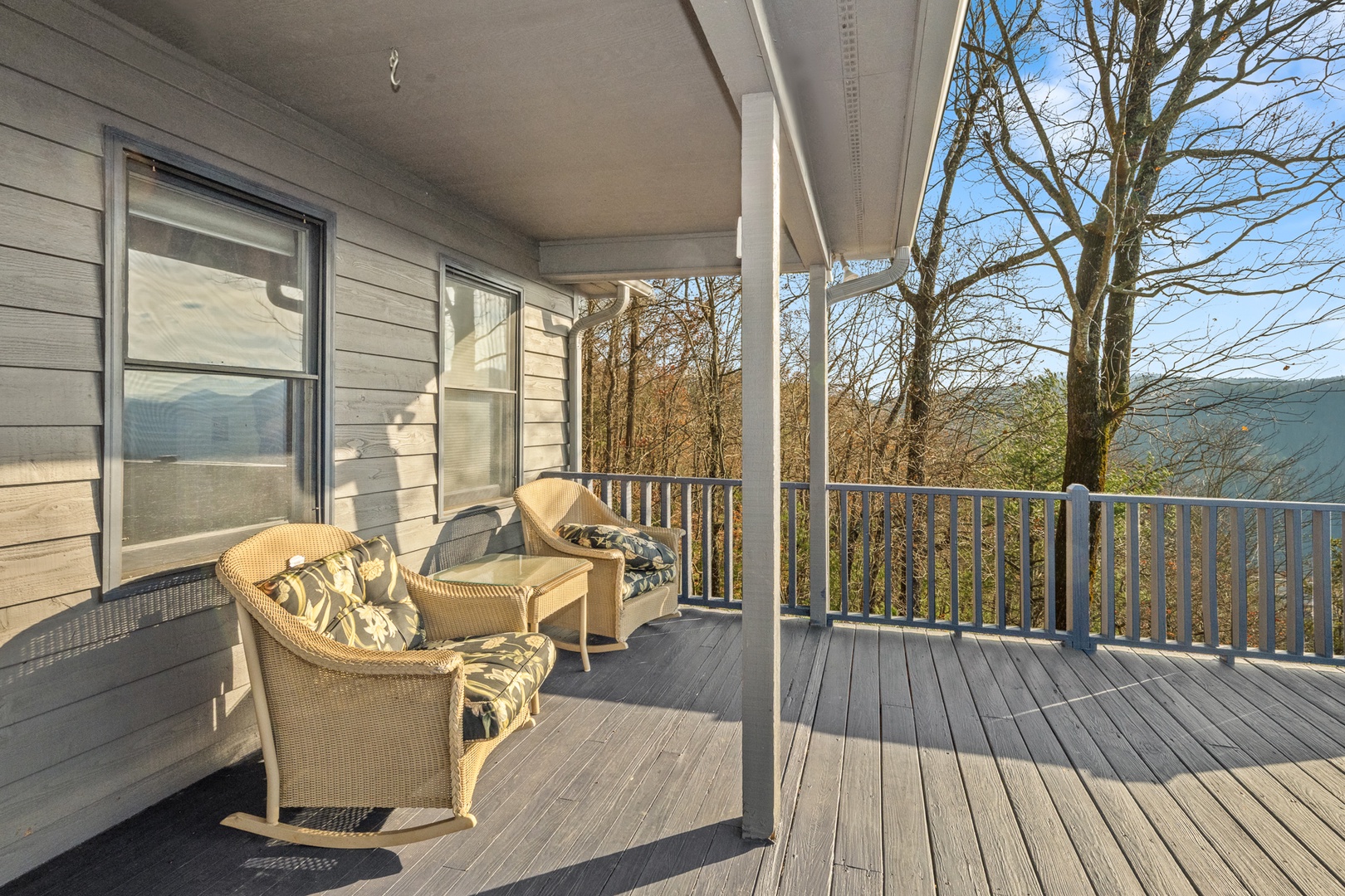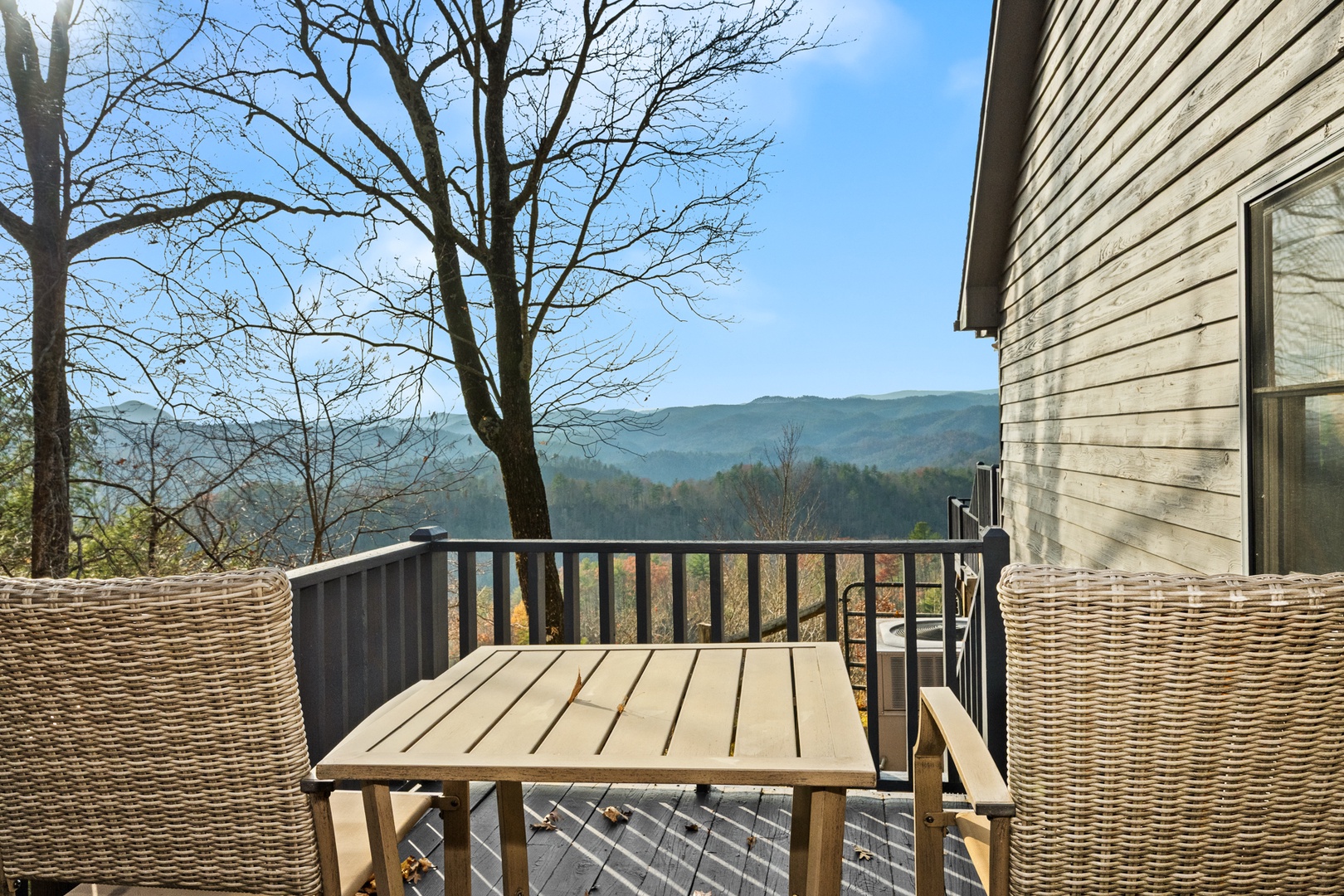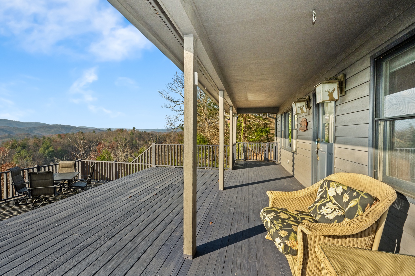 The fully equipped kitchen boasts granite countertops and opens into a bright dining area surrounded by windows that frame the beautiful mountain scenery. Wi-Fi and satellite TV ensure modern convenience, even in your peaceful retreat.