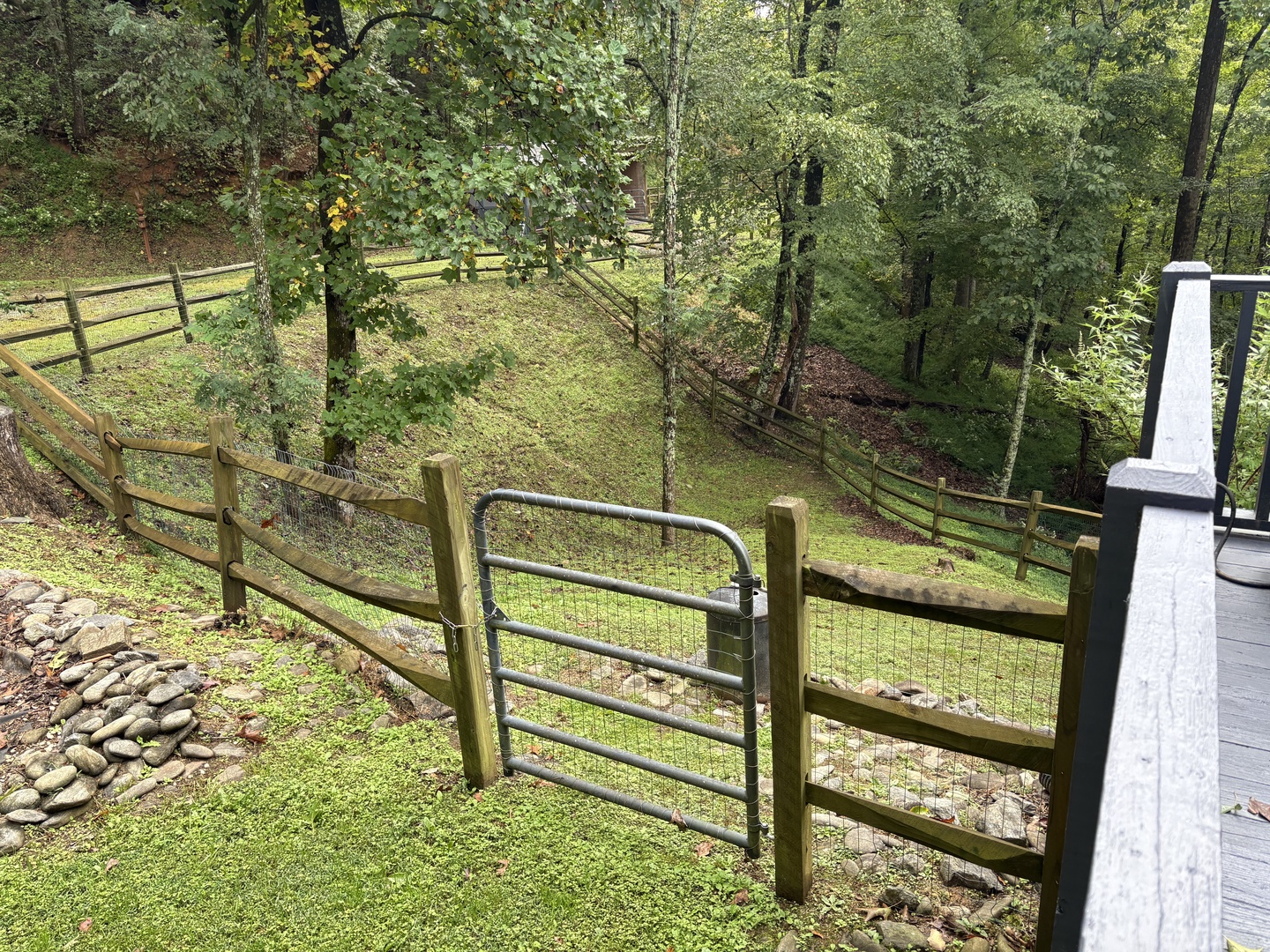• Fenced in back yard with wooden split rail fencing with a wire mesh enclosure.