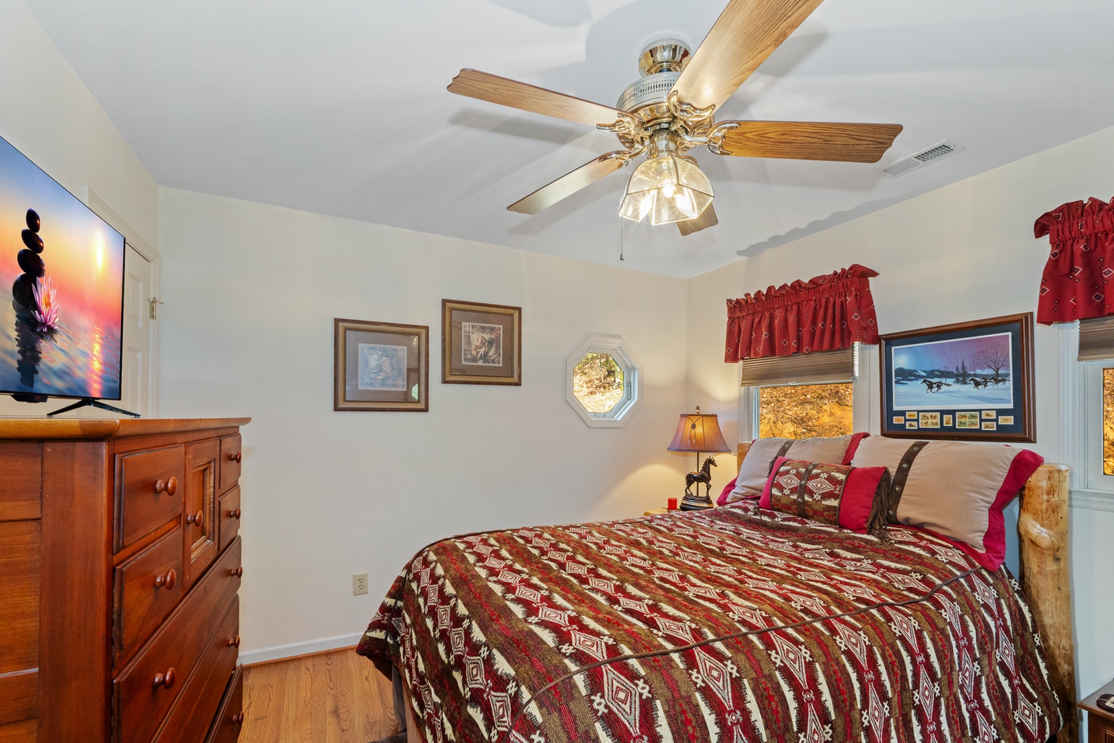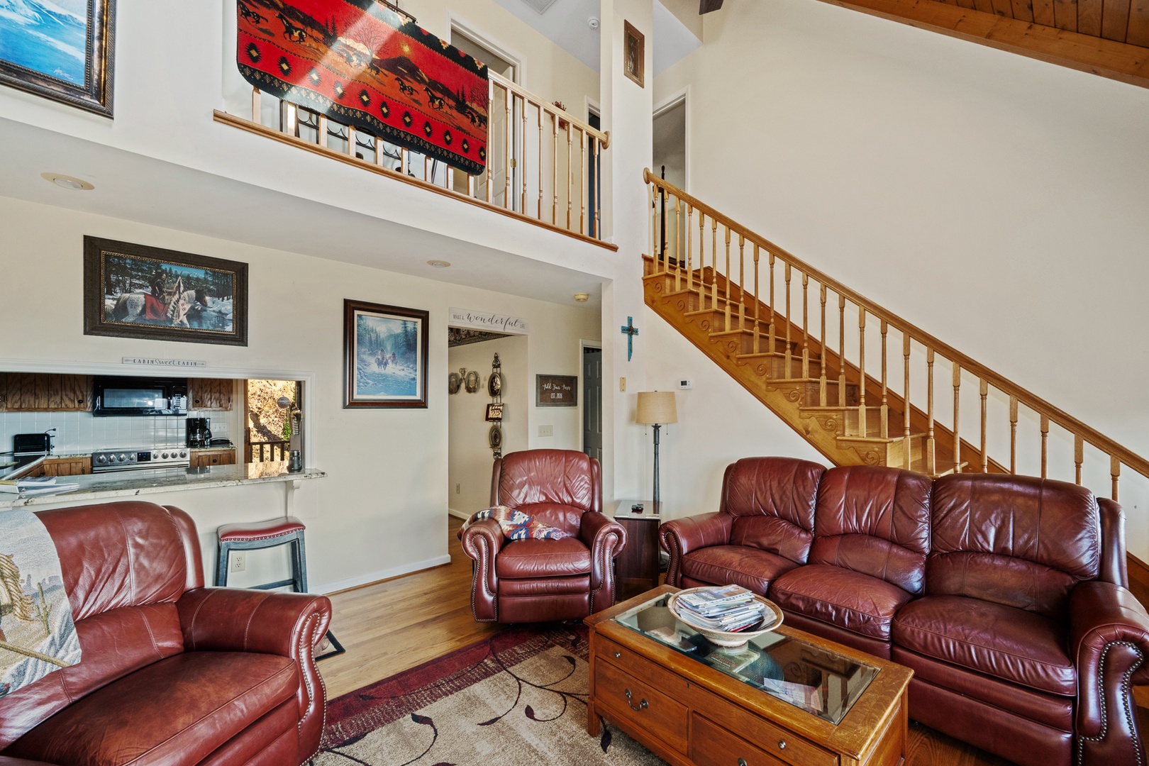 Inside, warm wood floors and Native American-inspired décor create a cozy and inviting atmosphere. The open-concept living area features a beautiful wood-burning fireplace, perfect for unwinding after a day of exploring. The master suite includes a king bed and a luxurious jetted tub, while two additional bedrooms each offer queen beds and private baths. A convenient half bath adds extra comfort for guests.
